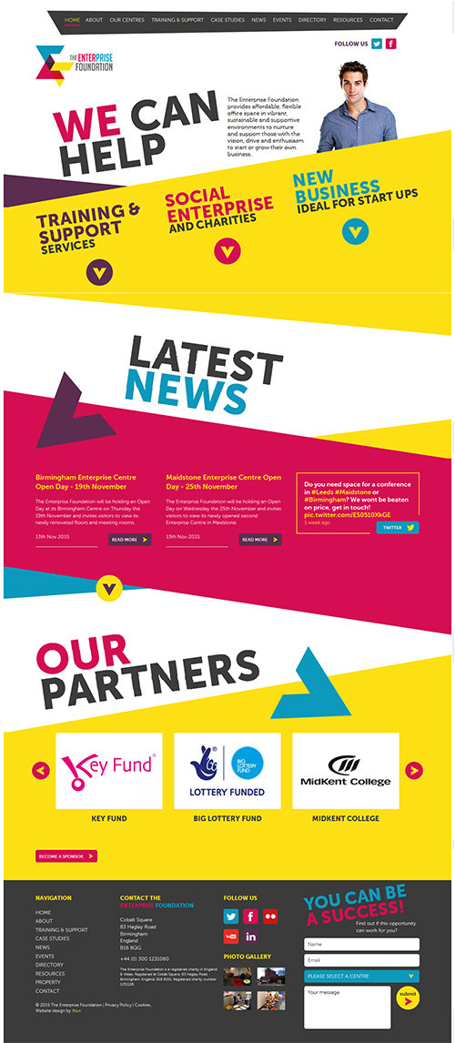 Here's a website that revels in colour. The Enterprise Foundation's home page combines the subtractive primaries, cyan, magenta and yellow, with violet (yellow's complement) in a crazy helter-skelter of colours, shapes and text. This bold design suggests a youthful co-working space that nourishes creative thinking and bright ideas.