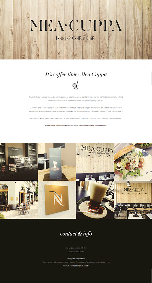This stylish, one-page website for Dutch cafe Mea Cuppa makes good use of colour in its photography, rather than its CSS. Images of pine furniture, the froth on a cappuccino, the off-white exterior of the café, and a fierce cheese salad sandwich all cohere to bring a distinctive, desaturated yellow colour scheme. Again, black and white make a bold impression, and the serif headings and sans serif body text give it a classy feel.