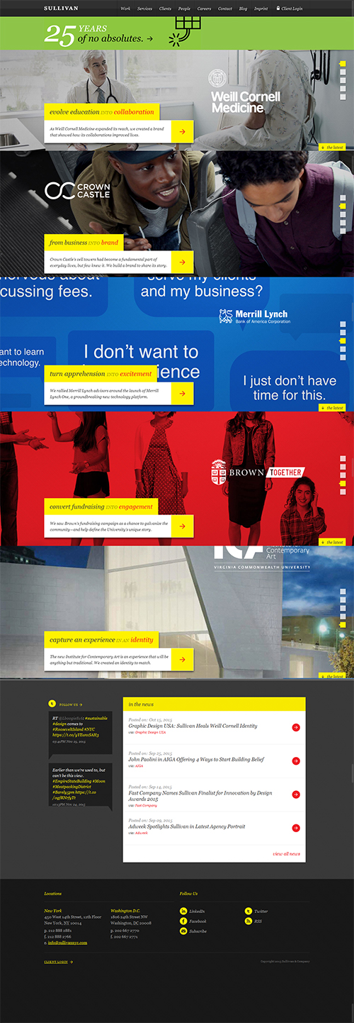 US design company Sullivan NYC also chose primary colours for their front page: yellow, red and blue, along with green. These colours, though, are used as accents with black being the dominant colour, giving the site a more mature feel than the Enterprise Foundation.