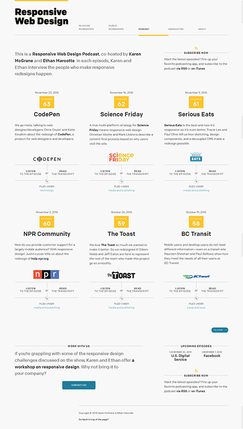 The slightly desaturated yellow-orange accent reinforces the hierarchy of the site beautifully. First, there's the line across the top of the site logo, which tells us that yellow-orange is an important brand colour. Next, the line under the currently selected main menu item informs us where we are on the site. The square episode number indicators clearly tell us that there are six episode summaries on this page. Finally, the symbol for the RSS/iTunes subscription links in the bottom right corner gives the colour a further utilitarian use. On the other hand, blue is clearly for the buttons.