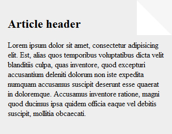 The .summary element has styles which make it look like a card: width, padding, background colour, and so on. These may vary from one project to another. But, for the folding corner to work, the most important thing we need to do is set position: relative. Why? Later, we'll want to start moving child elements around inside the summary, and as we know from CSS positioning 101, we can do this by giving the parent position: relative and the child element position: absolute.